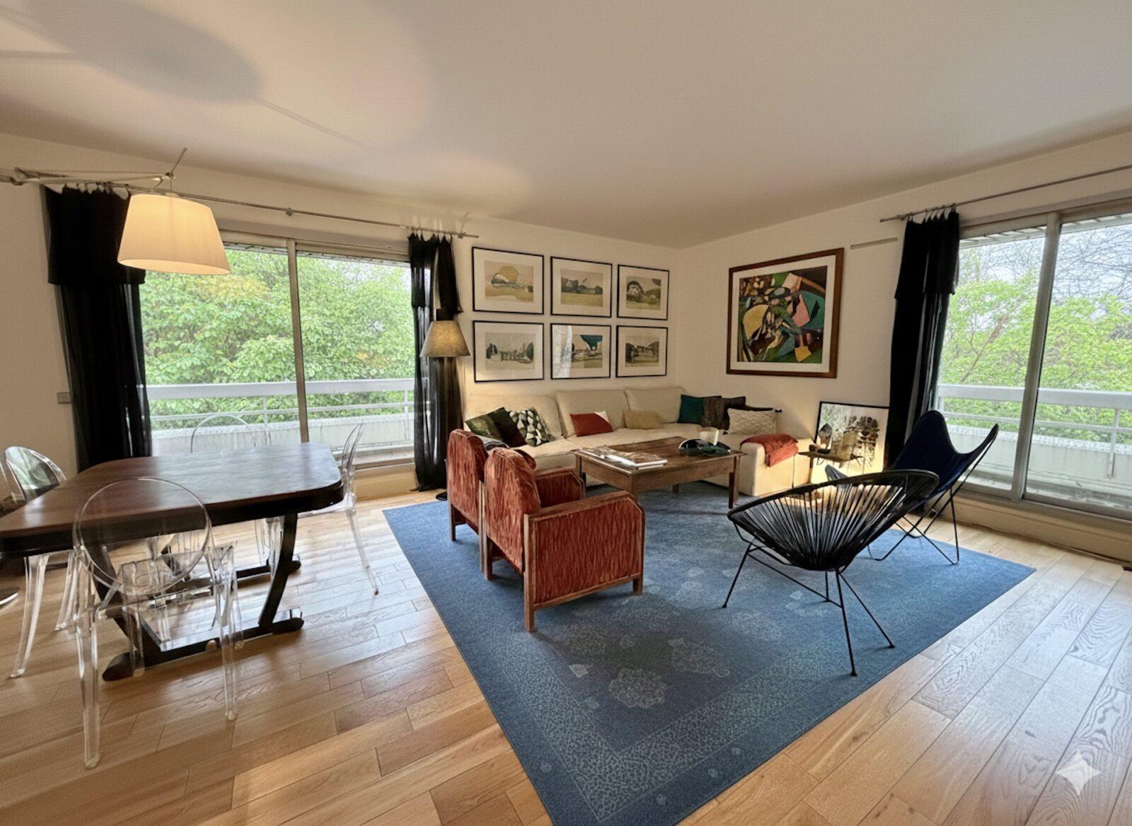 In a modern building, an 87 sq m apartment overlooking a garden and woods – double living room with balcony and terrace – 2 bedrooms – bathroom – separate WC – equipped kitchen – Excellent condition – Parking available.
