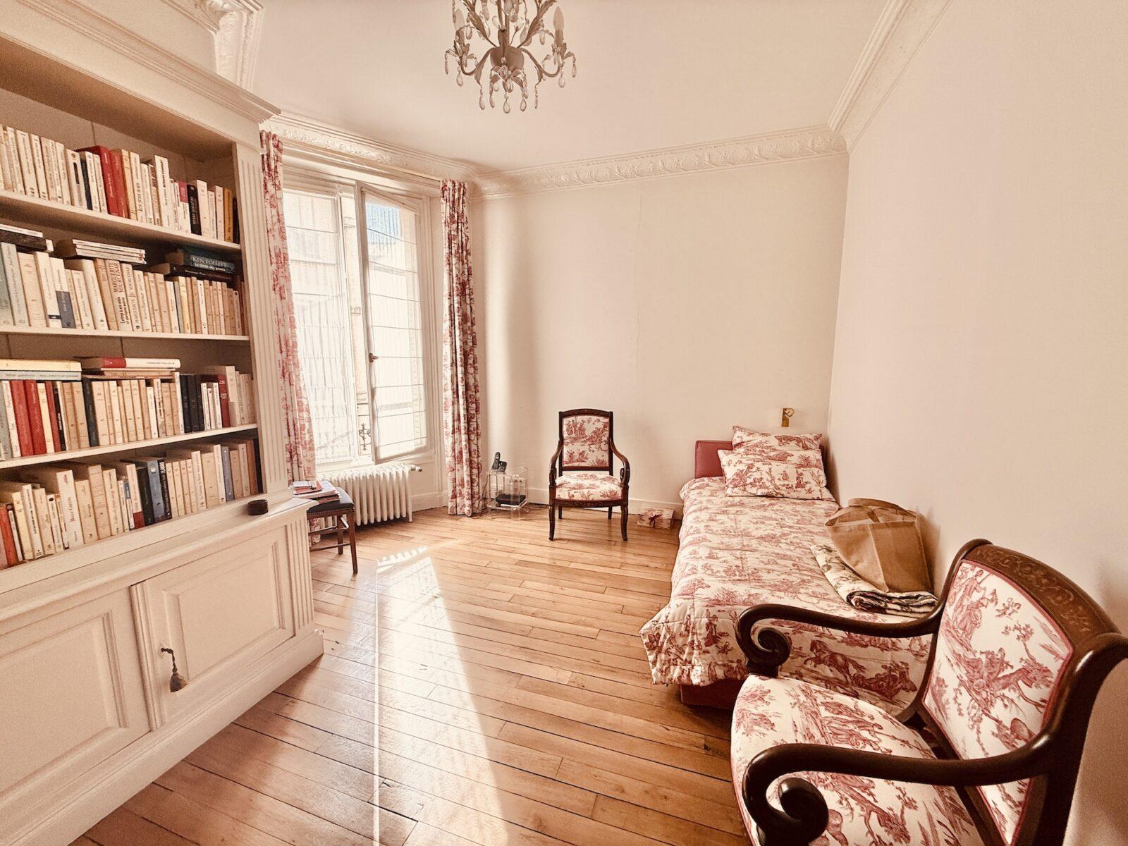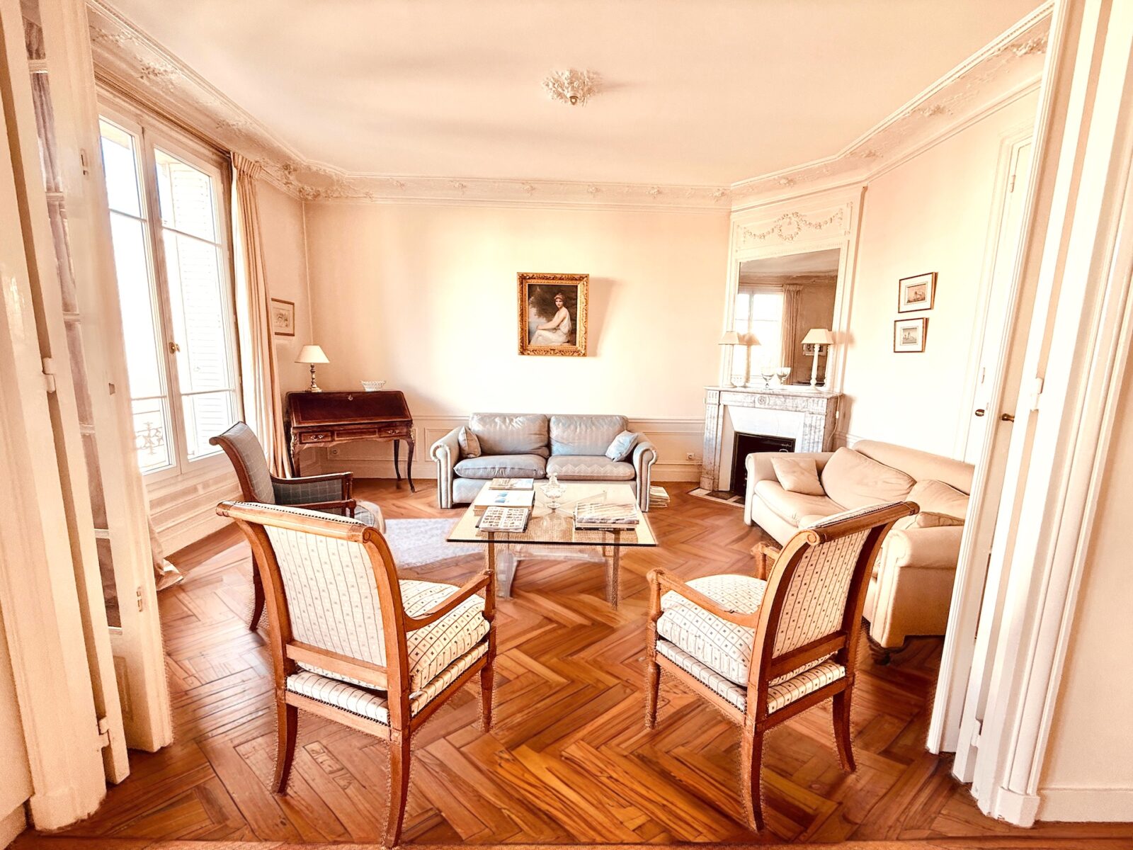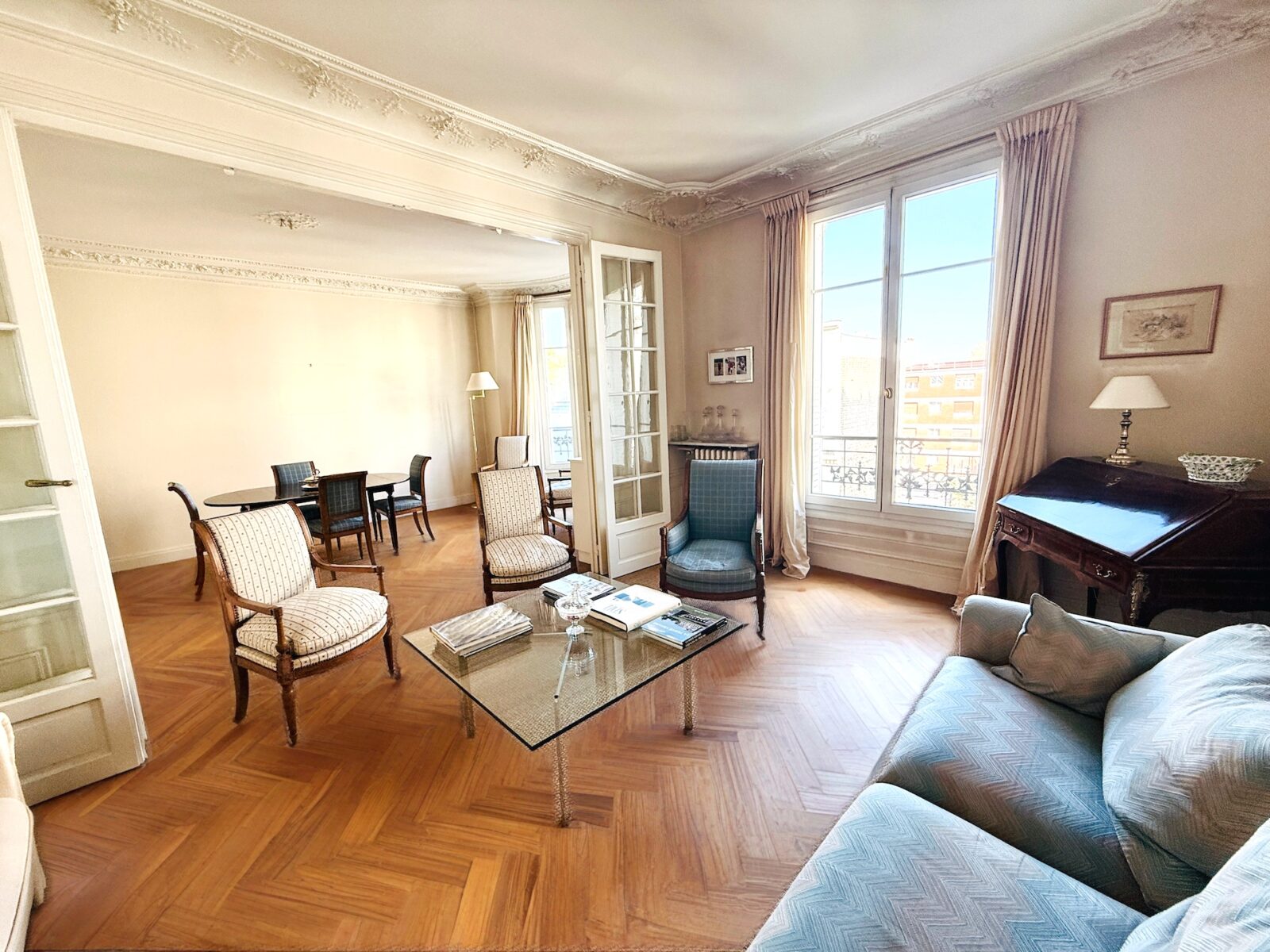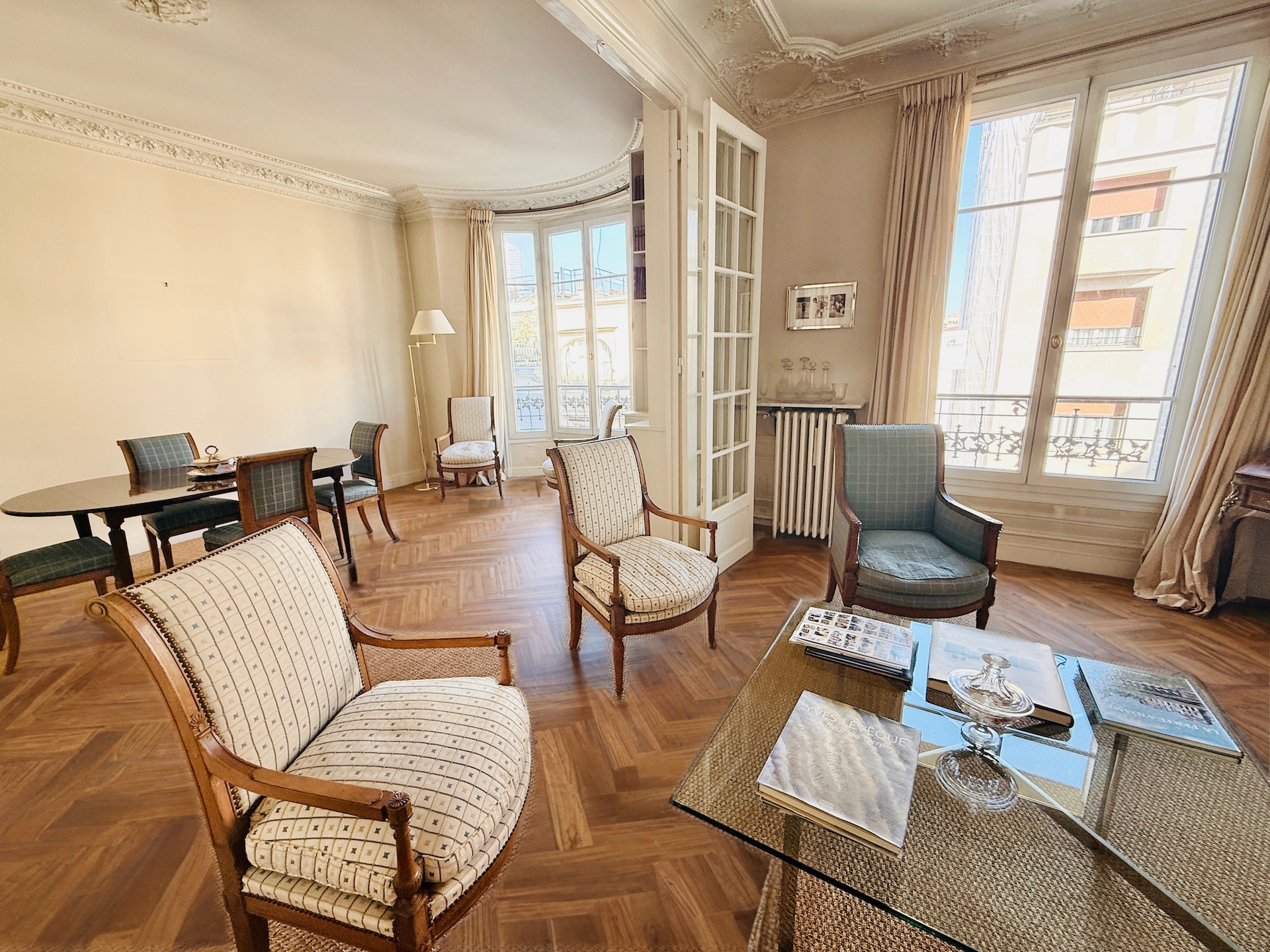 In a charming old building, a 106 m² apartment located on the 3rd floor and comprising a living room, dining room, 2 or 3 bedrooms, bathroom and shower room – Hardwood floors, moldings, fireplaces – Parking available